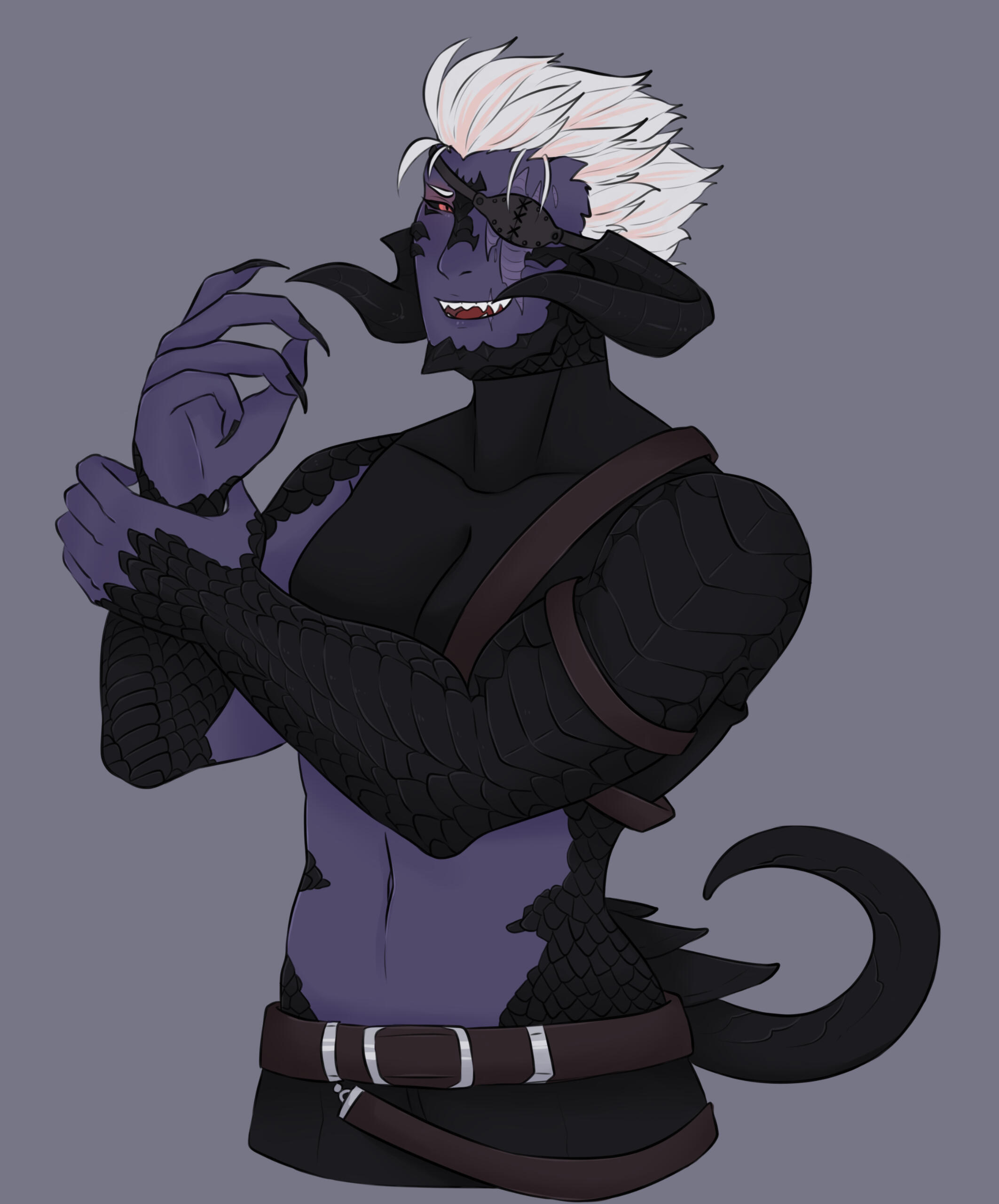 Whether by divine gift or genetic mutation, Khagadai is large— even compared to his Olkund cousins, Khagadai is immense in stature and heavily built.At a glance, he often appears like a glorious statue; towering, dressed most commonly in well-tailored garments and light armor, an odd contrast to his huffing and poor manners. One eye is nearly always covered with a black leather patch, but when it's absent, two scars carve twin ravines across his missing eye. A heavy tail sways and skips along the floor, too long even for his tall frame.